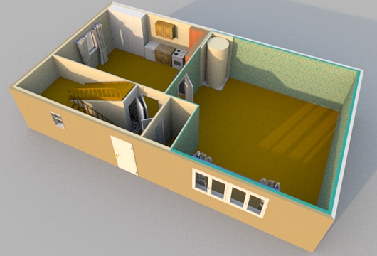 Pukkimäen keltaisessa talossa oli alakerrassa neljä erillistä asuinhuoneistoa, joten esimerkkikuvia pitää peilata sekä pituus että leveyssuunnassa eri nurkalla olevien asuntojen pohjaratkaisujen saamiseksi. Alakerran asunto oli huomattavasti yläkerran asuntoa suurempi ja valoisampi.