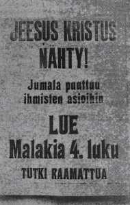 Tuhopolttaja teetti seinäjulisteen kesäkuun alkupäivinä 1000 kappaleen painoksena Sisä-Suomen lehden kirjapainossa. Työn tilaajaksi hän silloin ilmoitti vain oman nimensä ja lupautui maksamaan painatuskulut käteisellä, kuten sitten tekikin valmiit julisteet noutaessaan. Tällöin hän käyttäytyi aivan normaalisti etkä kirjapainon henkilökunta kiinnittänyt asiaan sen kummempaa huomiota. Teon motiivina oli ilmeisesti jonkinlainen viha uskontoa, uskonnollisuutta ja kirkkoa kohtaan.