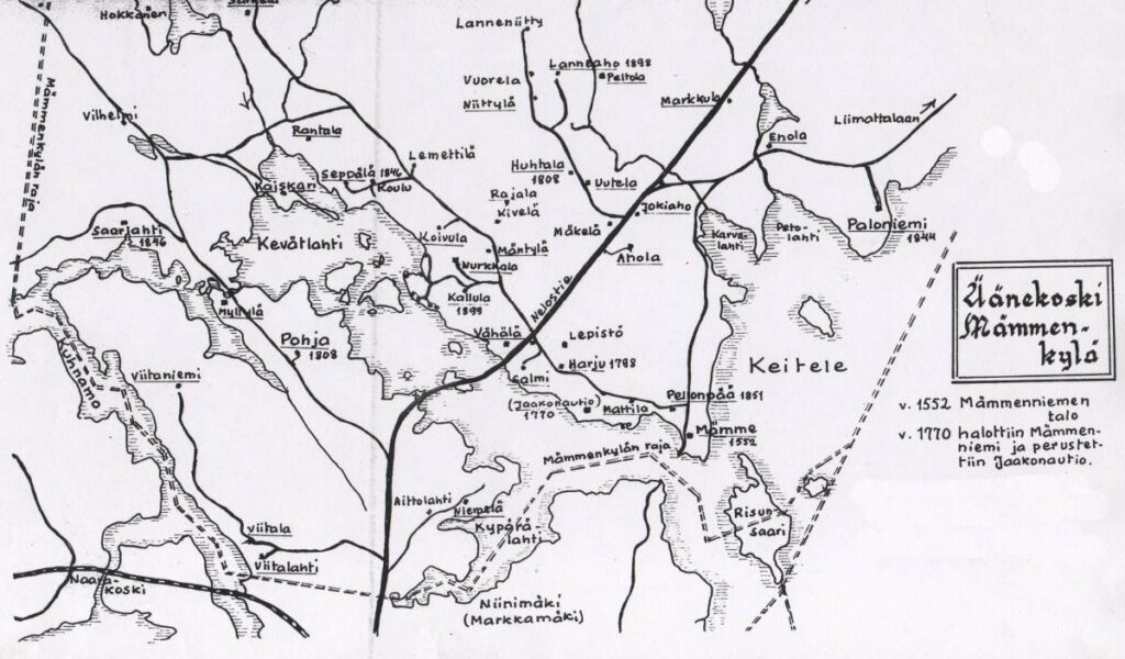 Äänekosken Mämmenniemen kantatalosta lohkotut uudistilat ja Mämmenkylän rajat eteläosassa Keitelettä.