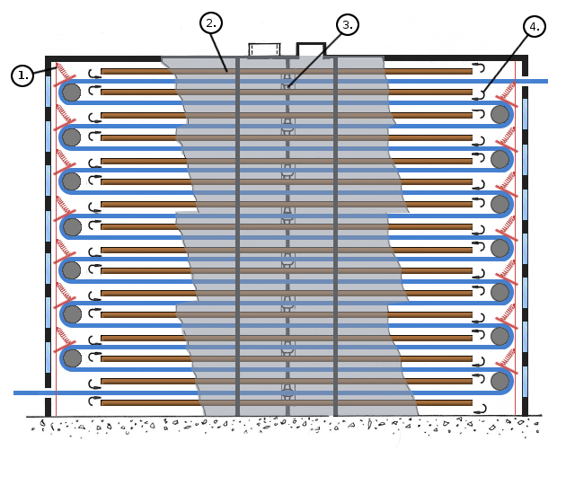 Yllä olevassa kuvassa on kuivauskaapin karkea toimintaperiaate sivulta. Selluraina syötettiin sisälle kaappiin kuvan vasemmasta alareunasta ja se poistui kaapista kuvan oikeasta yläreunasta. Kuvan numeroiden selitykset: 1 kaapin katkovahdit, 2 lämpöpatterit, 3 kiertoilmapuhaltimet ja 4 kuljetinpuolat.