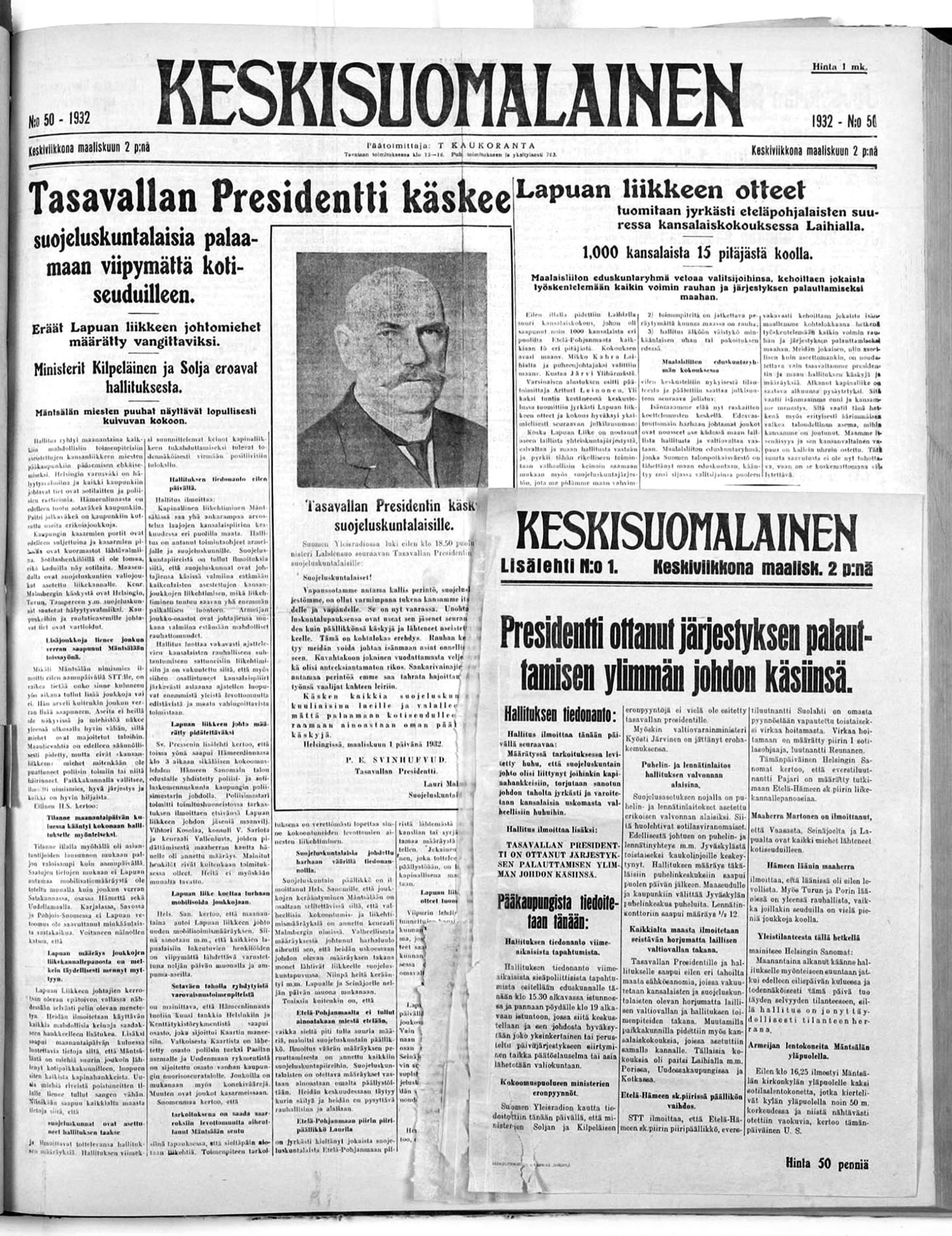 Keskisuomalainen -lehti kirjoitti Mäntsälän kapinasta ja sen päättymisestä 2.3.1932.