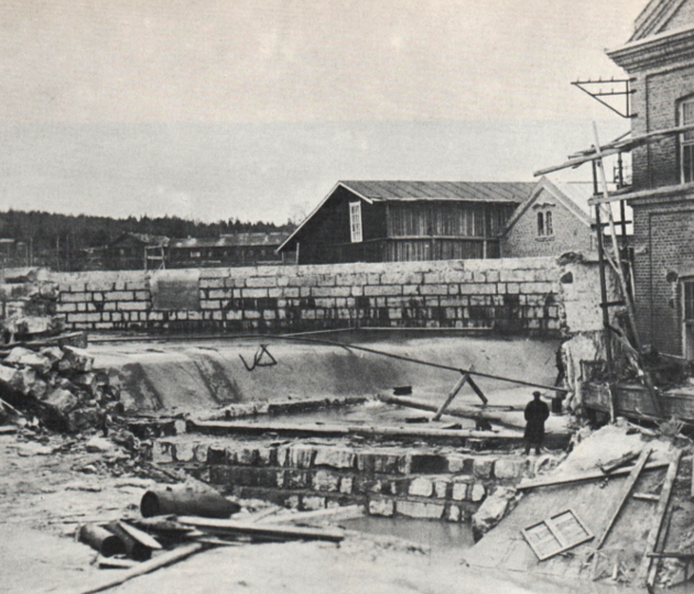 Kartonkitehtaan vesikanava murtui veden paineesta 26.5.1907. Vesimassat syöksyivät konesalin läpi kohti Kuhnamoa. Onni onnettomuudessa oli se, että kartonkikone oli seisokissa ja konesalissa ja puuhiomoilla ei työskennelty. Alla valokuva onnettomuuspaikalta 26.5.1907. Kuvakulma on vanhan kartonkikonesalin pohjoispäästä kohti Mannilaa ja Suolahtea. Murtuneen kanavan taustalla näkyvät rakennelmat purettiin 1930-luvun alussa vesivoimalaitosta rakennettaessa.
