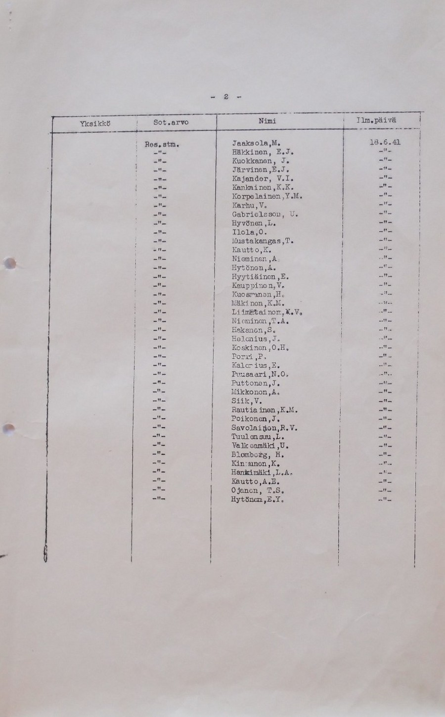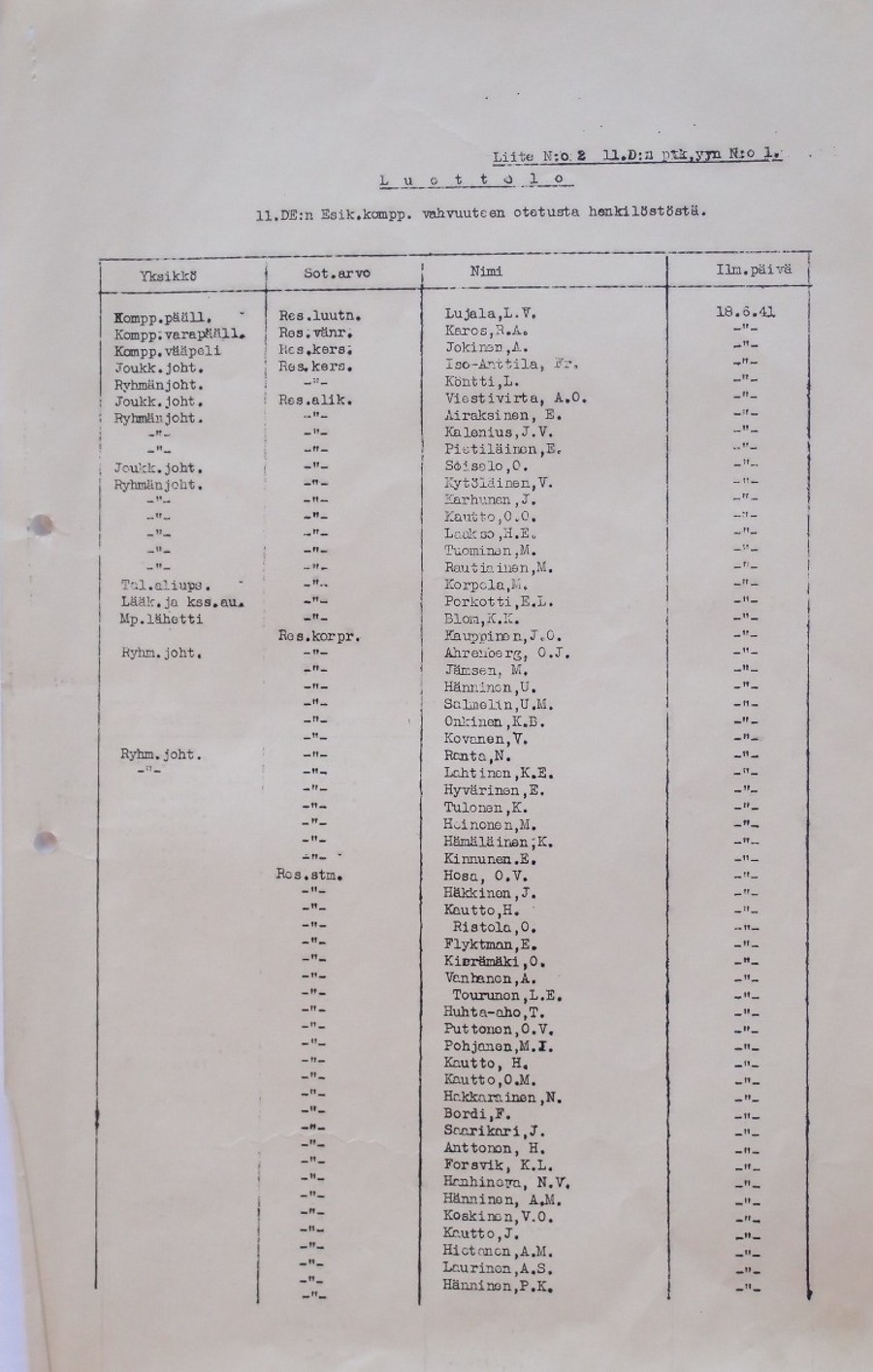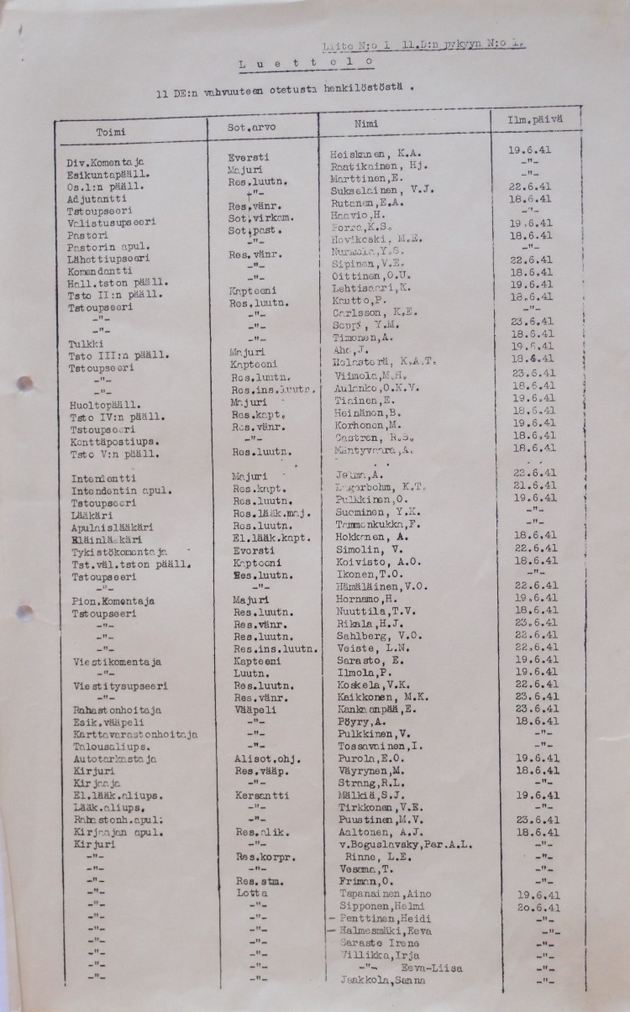 Alkuperäinen Sota-arkistossa oleva 11.Divisioonan esikunnan vahvuusluettelo ajalta 19.6.1941.