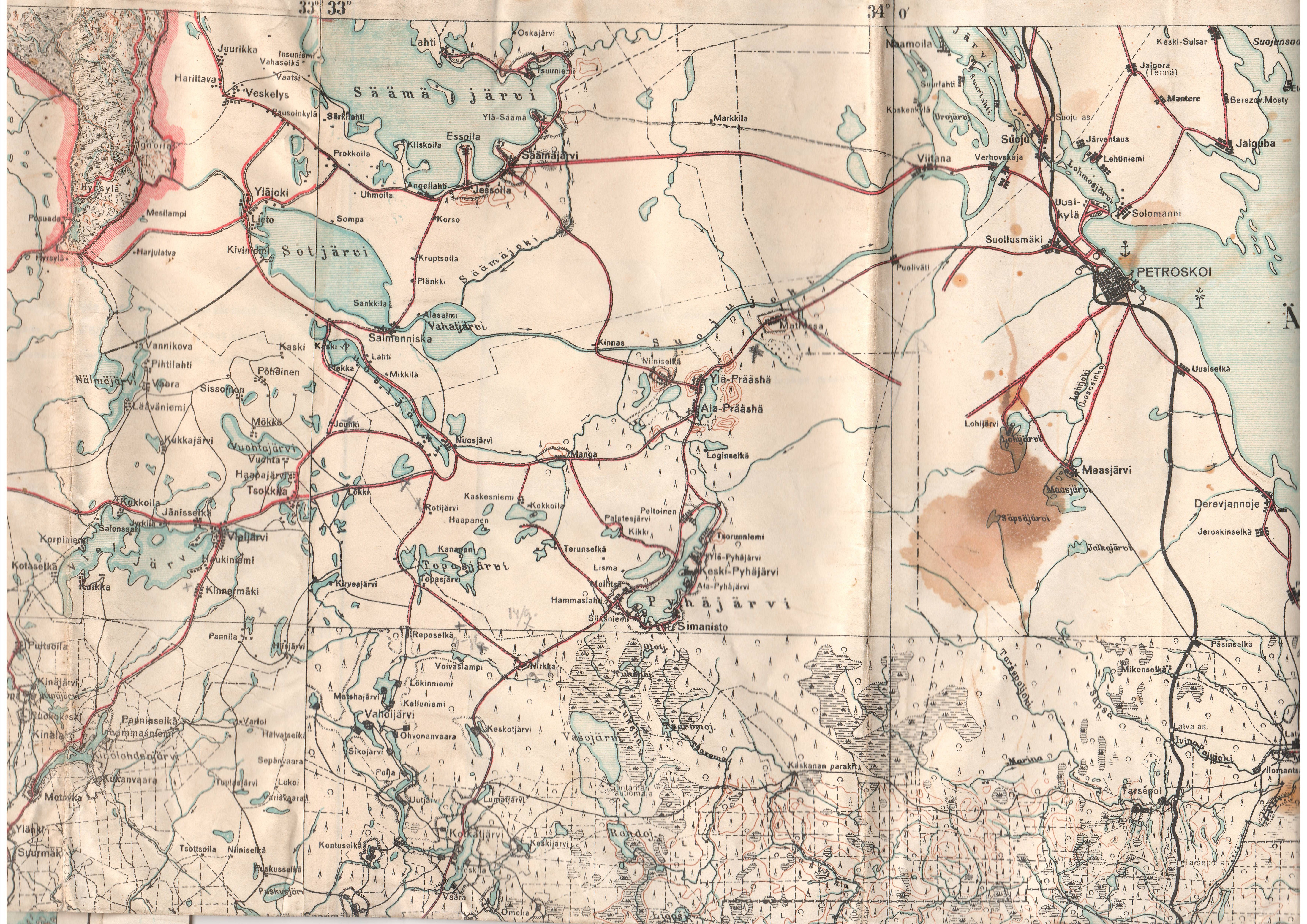 Alla kartta Säämäjärvi-Prääsä-Matrossa-Polovina-Petroskoi alueesta. Karttakuvan koko on 5,1Mb, joten sen lataaminen saattaa hitaammalla nettiyhteydellä kestää hieman. (Lähde:joni.paananen@luukku.com, Viitasaari). Kartan resoluutiota voi säätää selaimen CTRL ja +/- näppäinyhdistelmällä.