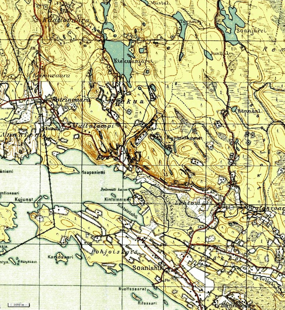 Kiekuan ja Soanlahden kylien alueen topografinen kartta