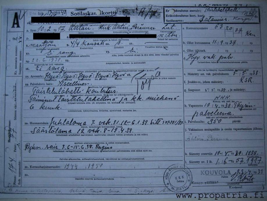 Esimerkki sotilaspassin merkinnöistä